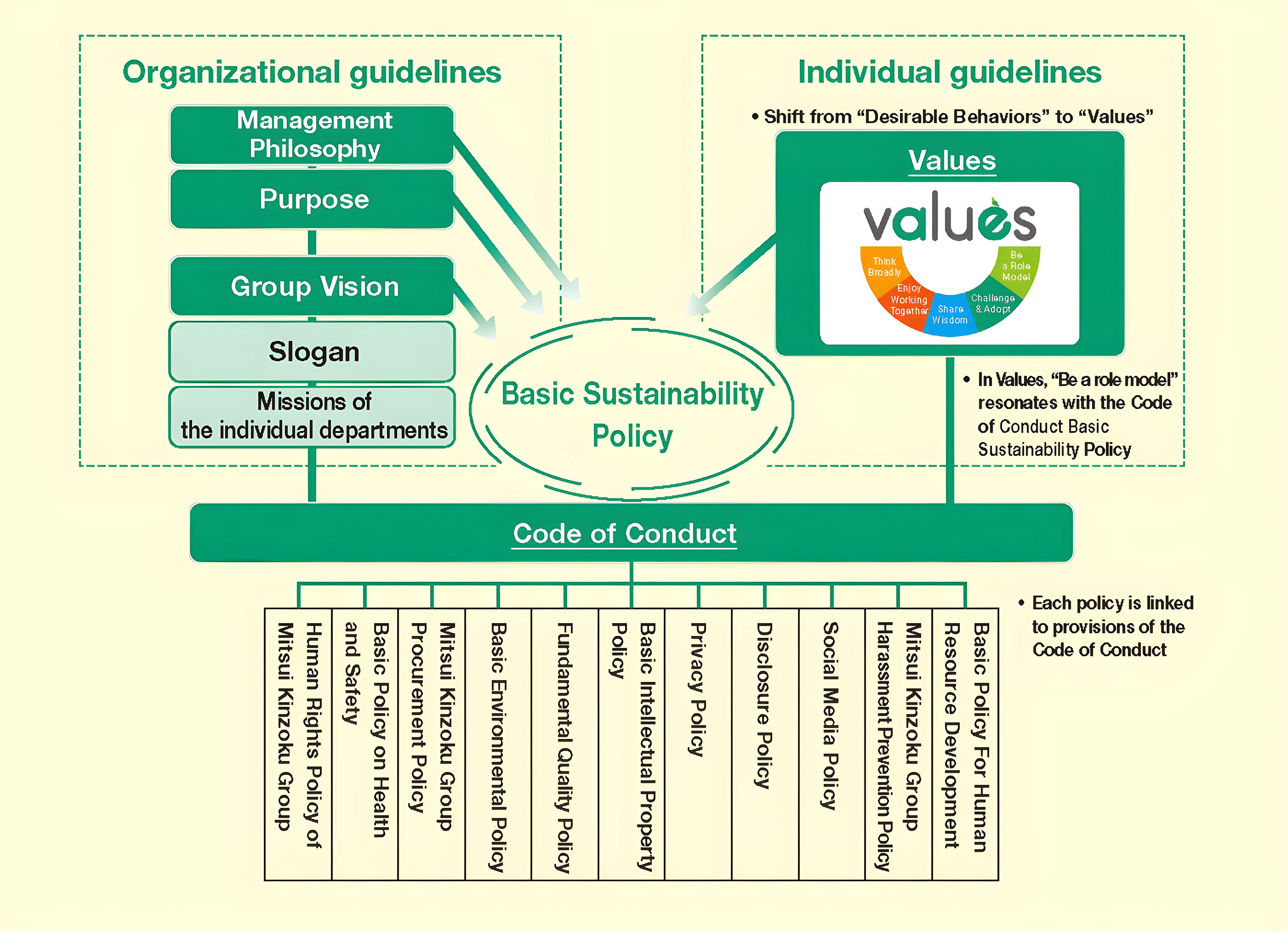 Mitsui Kinzoku group has established our Values. Following this, the Mitsui Kinzoku Group’s Basic CSR Policy was revised and renamed as Basic Sustainability Policy.